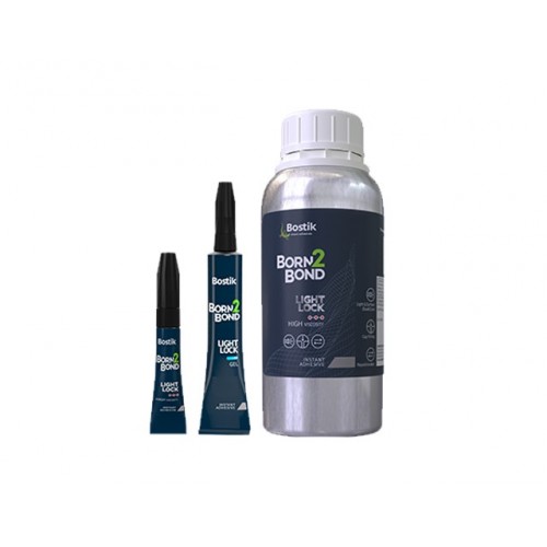 Born2Bond LightLock HV (vâscozitate ridicată) este un adeziv cianoacrilat/UV cu dublă polimerizare, cu proprietăți de înflorire redusă. Curățarea UV permite lipirea rapidă prin părțile transparente și întărirea rapidă a zonelor expuse la lumină, în timp ce lipirea cu cianoacrilat asigură întărirea între substraturile opace