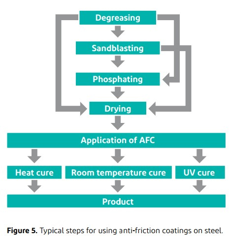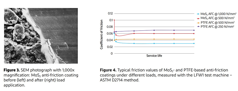 Acoperirile antifricțiune se aplică, în general, la o grosime a peliculei uscate de 10-20 µm. Sub sarcină, structura peliculei este compactată, producând o suprafață extrem de netedă care acoperă asperitățile materialului suport (figura 3). Valorile coeficientului de frecare ale acoperirilor antifricțiune pe bază de MoS2 sunt comparate cu cele ale acoperirilor pe bază de PTFE în figura 4. Valoarea coeficientului de frecare a acoperirilor pe bază de Mos2 scade după o scurtă fază de rodaj.