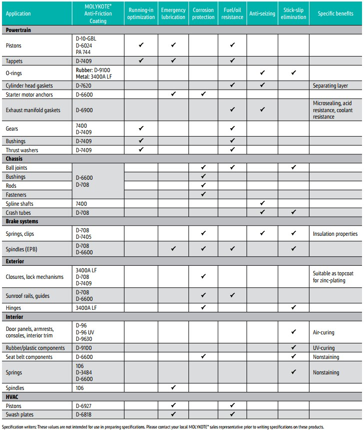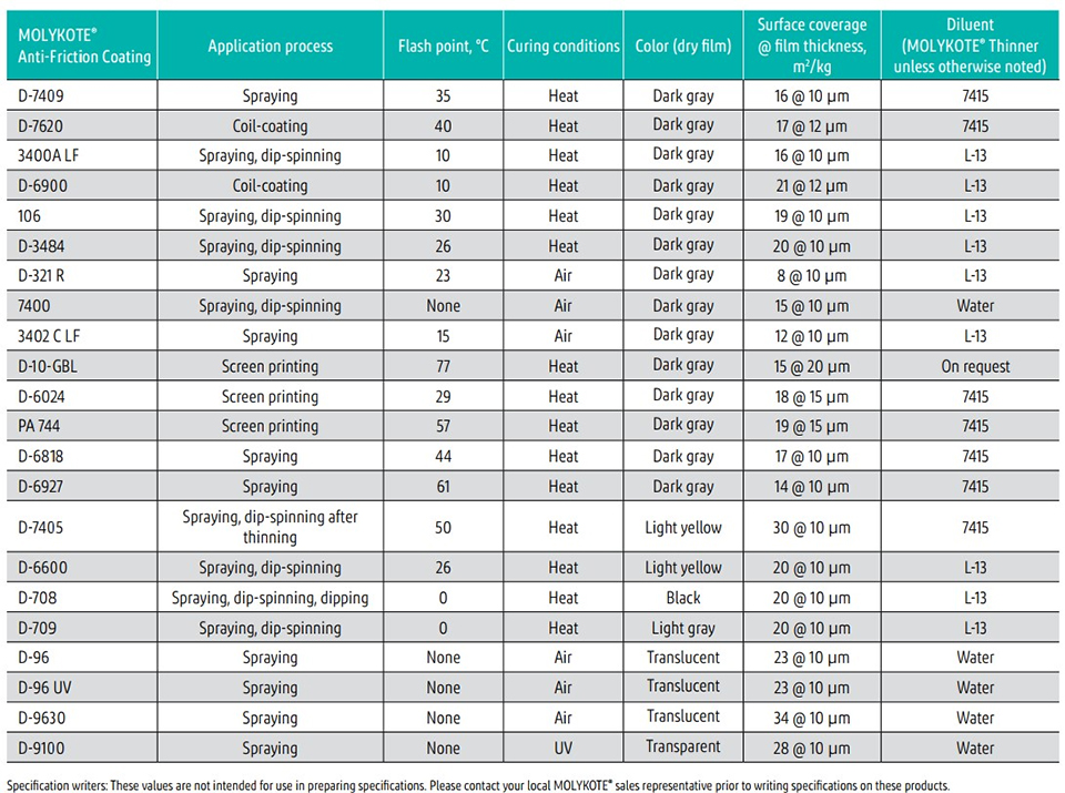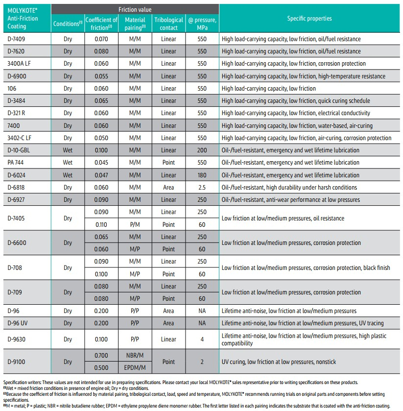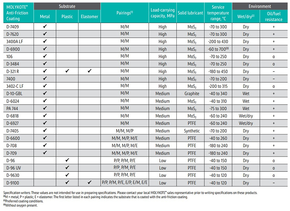 Lubrifianți puternici cu peliculă uscată pentru asamblarea ușoară a pieselor glisante; MOLYKOTE® 3402-C LF Acoperire antifricțiune oferă, în plus, o bună protecție împotriva coroziunii; MOLYKOTE® D-321 R Acoperire antifricțiune este disponibil și în cutii de spray