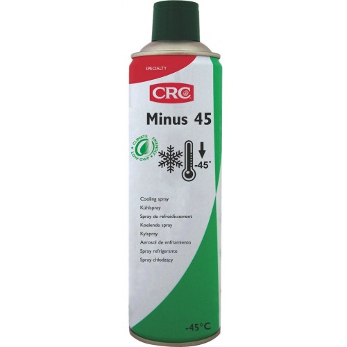 Lichid de răcire inert, neinflamabil. Lichid de răcire uscat , inert , neinflamabil, utilizabil de la -45 ° C, pentru mentenanta electrică și electronică. CRC Minus 45® poate fi utilizat pentru mentenanta, detectarea defecțiunilor cat și repararea componentelor din domeniul electric și electronic: Testarea termometrelor și termostatelor, localizarea pieselor electrice defecte, găsirea conectoarelor defecte, localizarea tranzistoarelor cu diode defecte, instrumente „dentare” .